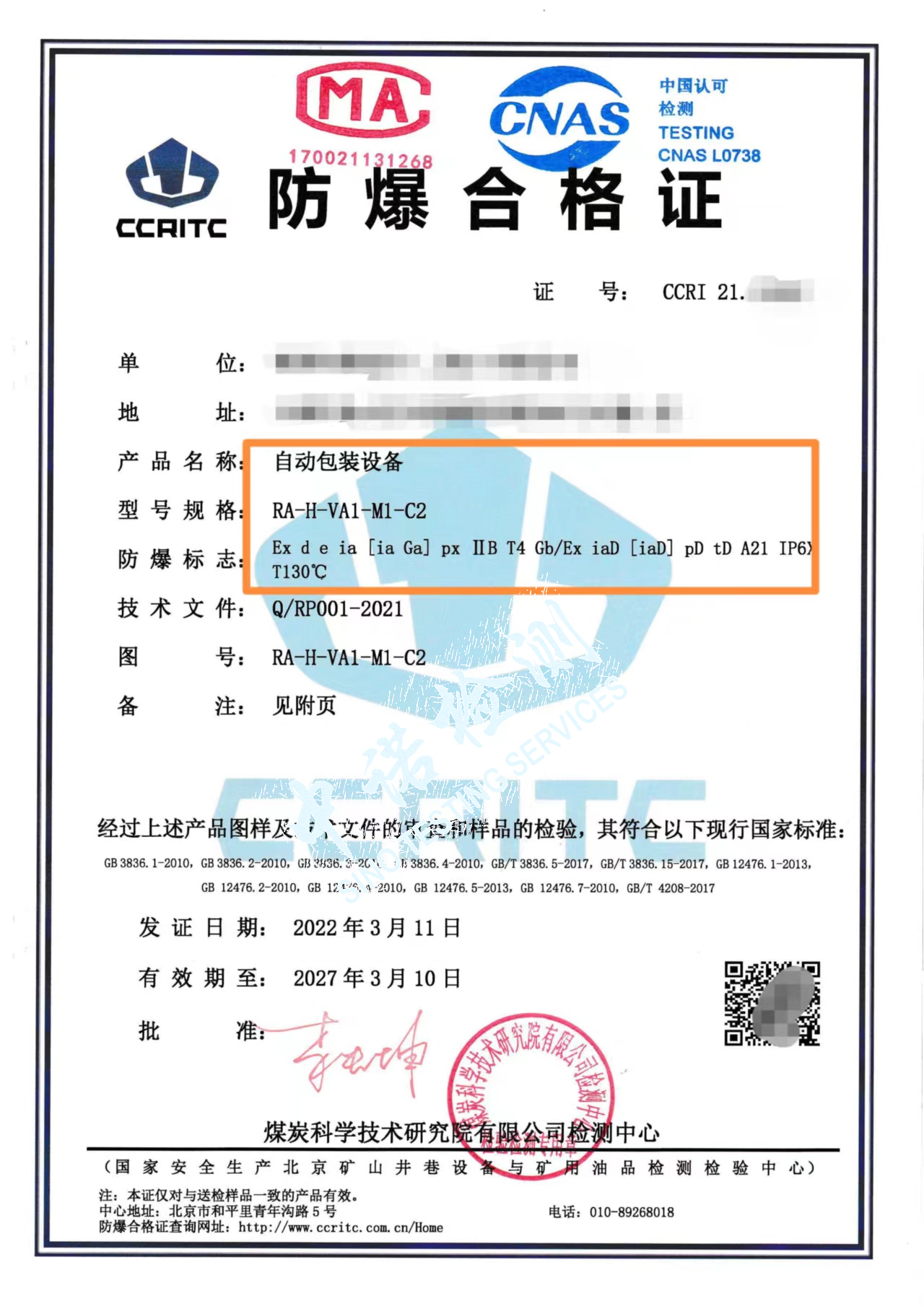 中諾檢測成功辦理的自動包裝設(shè)備的防爆標志是: